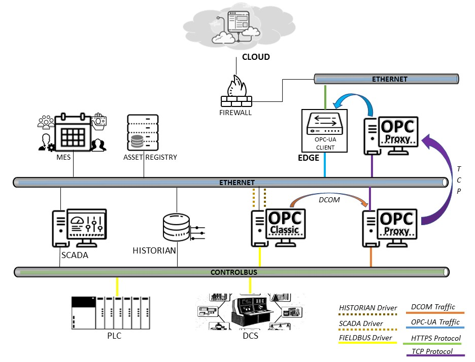 An OPC Proxy enables the OPC Classic server, which is based on the COM/DCOM architecture, to be connected with the OPC UA products and can be used to manage the traffic in both directions at the same time. It typically wraps an OPC UA server that gets data from its internal COM client. The wrapper is needed to connect the OPC UA client to the OPC Classic servers. As a proxy, it supports the traffic in the opposite direction. The proxy is a COM-based ...