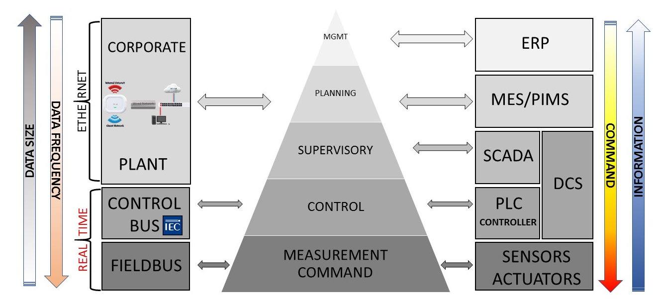 The following simplified schema represents a typical automation architecture with reference to the CIM pyramid. Each level, shown in the center, has been linked on the left-hand side to the related communication networks, and on the right-hand side, to the devices or applications involved: