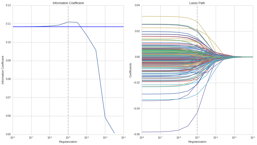 As before, we can plot the average information coefficient for all test sets used during cross-validation. We see again that regularization improves the IC over the unconstrained model, delivering the best out-of-sample result at a level of λ=10-5. The optimal regularization value is quite different from ridge regression because the penalty consists of the sum of the absolute, not the squared values of the relatively small coefficient values. We can also see that for this regularization level, the coefficients have been similarly shrunk, as in the ridge regression case: