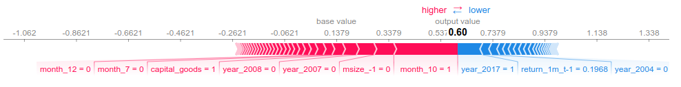 The following force plot shows the cumulative impact of various features and their values on the model output, which in this case was 0.6, quite a bit higher than the base value of 0.13 (the average model output over the provided dataset). Features highlighted in red increase the output. The month being October is the most important feature and increases the output from 0.338 to 0.537, whereas the year being 2017 reduces the output.