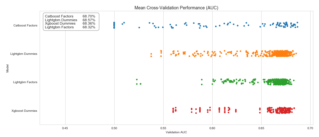 When comparing average cross-validation AUC across the four test runs with the three libraries, we find that CatBoost produces a slightly higher AUC score for the top-performing model, while also producing the widest dispersion of outcomes, as shown in the following graph: