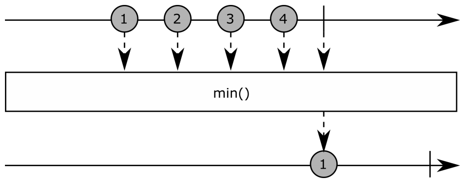 The min operator emits the item of the source observable that contains the minimum value of the whole sequence. The following figure shows the marble diagram of this operator: