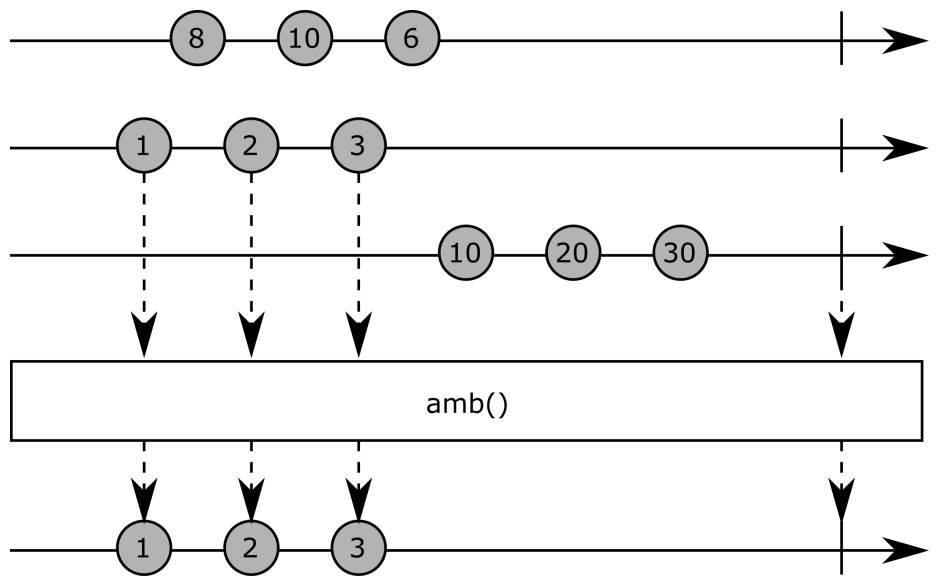 The amb operator emits items from the first observable of two that emits an item first. The following figure shows the marble diagram of this operator: