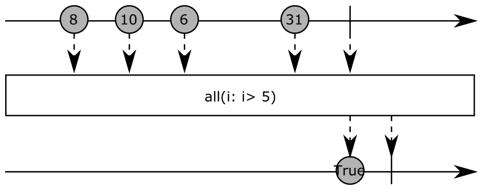 numbers = Observable.from_([11, 12, 13, 14])numbers.all(lambda i: i > 10).subscribe( ...