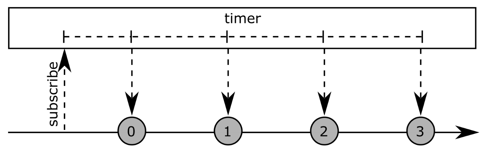 The timer operator creates an observable that emits an item after an absolute or relative time has elapsed. After this first emission, the observable emits items periodically if a period value has been provided. The following figure shows the marble diagram of the timer operator without a period: