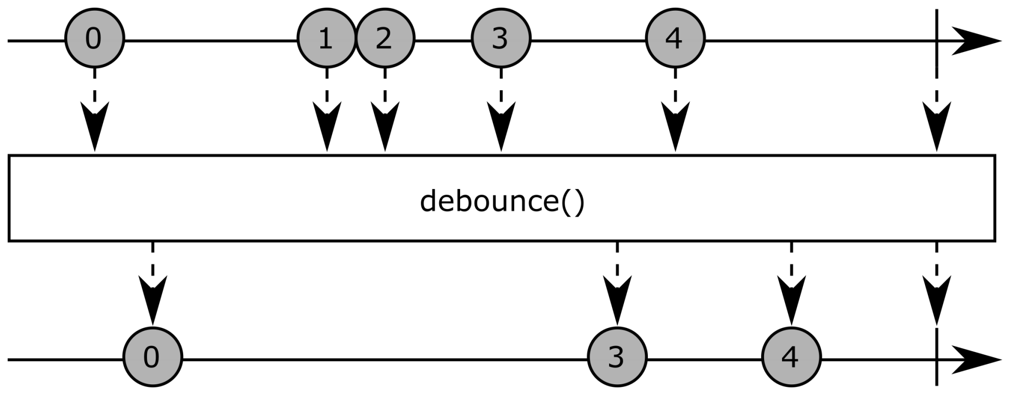 The debounce operator allows you to wait for a defined delay until an item is emitted. Each time an item is received, a timer is started with this delay as an expiration time. Items are emitted only when the timer triggers. This has the effect of dropping any item that is received before the delay has completed.