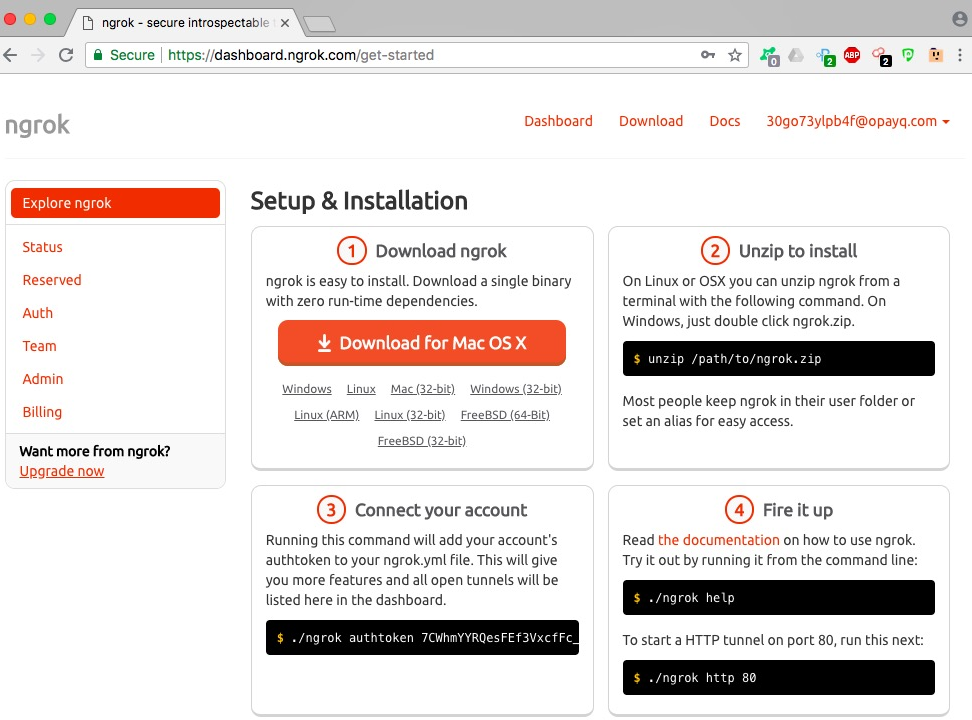 According to its website (https://ngrok.com/), ngrok is a secure introspectable tunnel to the localhost. This exposes local servers behind NATs and firewalls to the public internet over secure tunnels. So, how do we use ngrok?