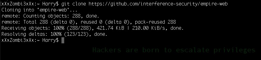 It can sometimes be quite difficult to use Empire in command line mode. To avoid this, we're going to look at how to use the Empire web interface, which can be managed much more easily. To begin with, let's clone the GitHub repository:
