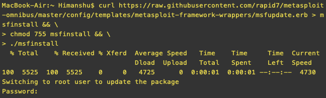 curl https://raw.githubusercontent.com/rapid7/metasploit-omnibus/master/config/templates/metasploit-framework-wrappers/msfupdate.erb > msfinstall && \ chmod 755 msfinstall && \ ./msfinstall