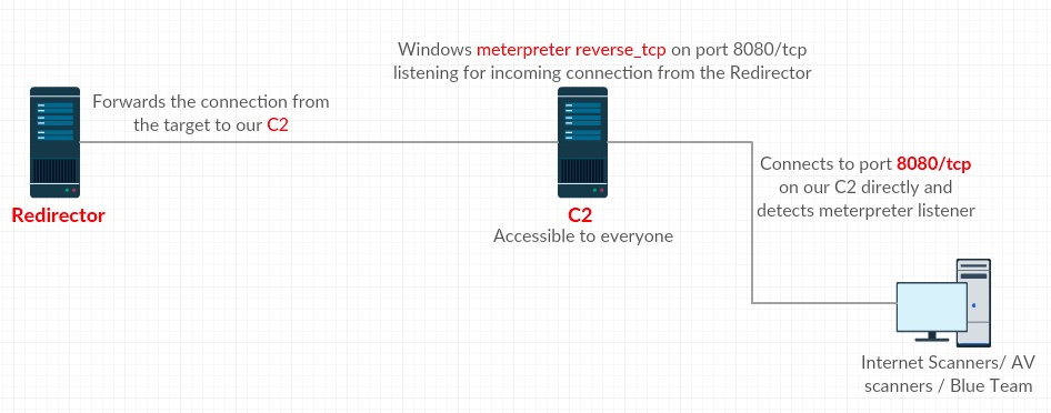 If someone tries to connect to our C2 server, they will be able to detect that our C2 server is running a Meterpreter handler on port 8080/tcp: