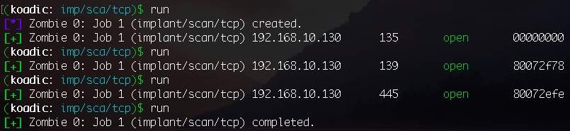 use implant/scan/tcp info set rports 135,139,445 set rhosts 192.168.10.130 set zombie 0