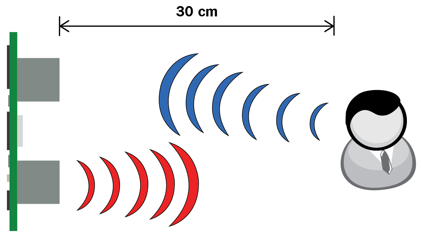 As indicated in the preceding diagram, let's imagine that the distance between the sensor and the object is 30 cm. The ultrasonic sensor travels at a speed of sound, which is 340 m/s, or 0.034 cm/μs.