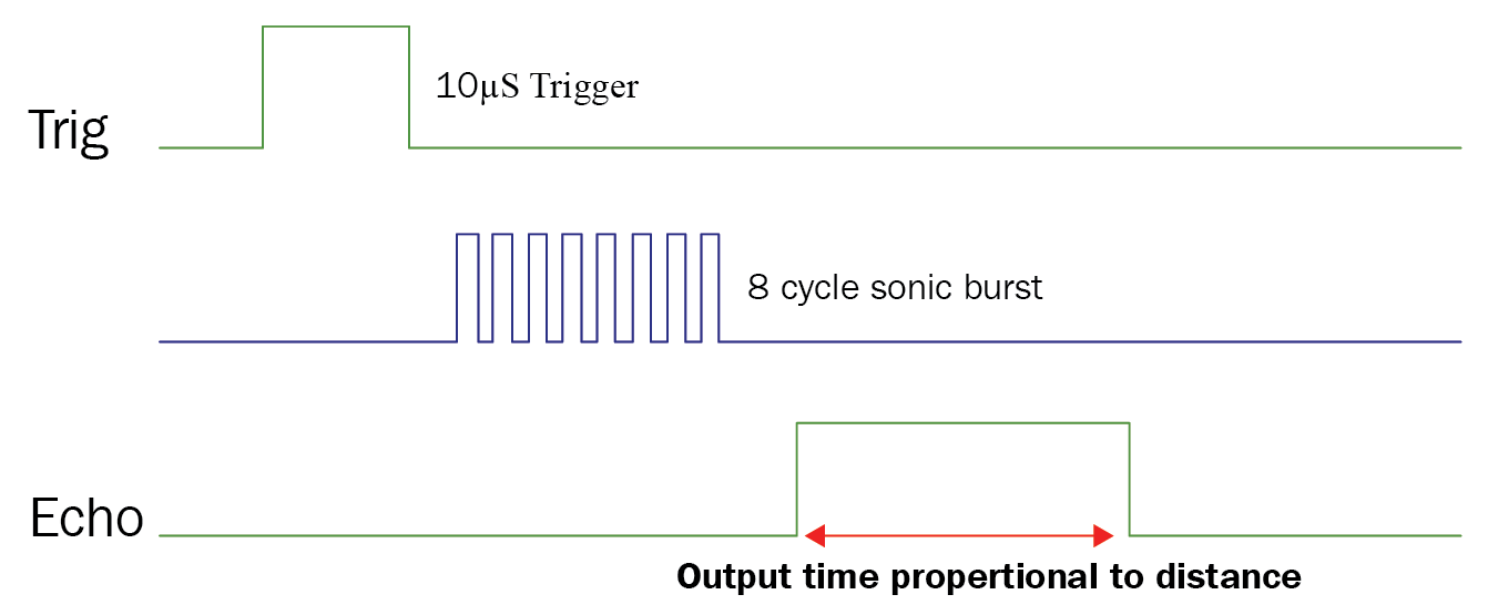 In order to measure distance, the ultrasonic sensor generates an ultrasonic pulse. To generate this ultrasonic pulse, the trigger pin is set in a high state for 10 microseconds. This produces an eight-cycle sonic burst that travels at the speed of sound, which is received by the echo pin after colliding with an object. When this eight-cycle sonic burst is received, the echo will become high and it will remain high for a time duration that is proportional to ...