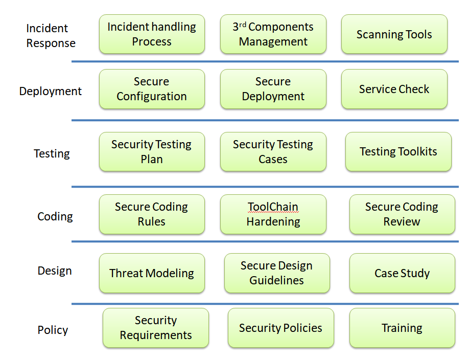 You may also consider building an internal security knowledge portal, which includes the security requirements, case study, guideline or template and so on. An in-house security portal not only helps to deliver the organization-level related security policies, but also to build an internal knowledge base. The project team can also share their best practices or tools on the portal, to increase experience sharing across business units. An ideal security knowledge portal may cover the following areas, as shown in the following figure: