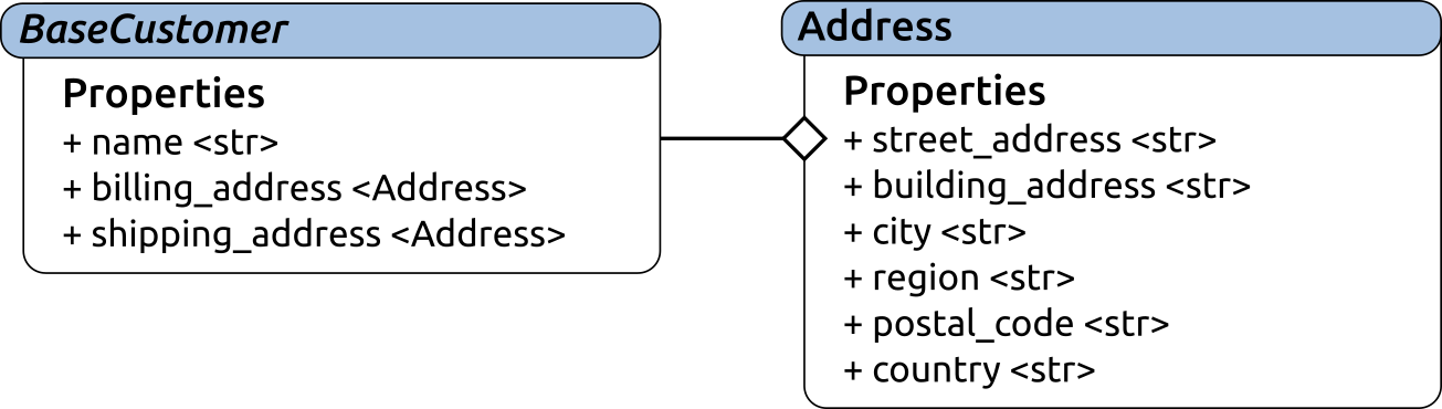 The class that defines what a customer's data structure looks like is very simple, and uses code structures that have already been established in Address and BaseArtisan for all of its properties. Like the relationship of BaseArtisan with concrete Artisan instances, Customer objects are expected to vary significantly in what they can do, and perhaps what data access is allowed across the different components of the system. Once again, we'll start by defining an ABC—BaseCustomer—rather than a concrete Customer class: