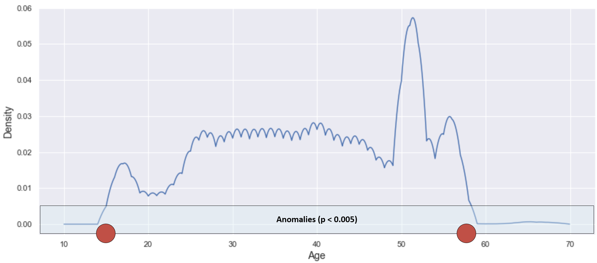 The red dots indicate the age limits for a sample to be classified as an anomaly. Let's compute the probability densities for some test points:
