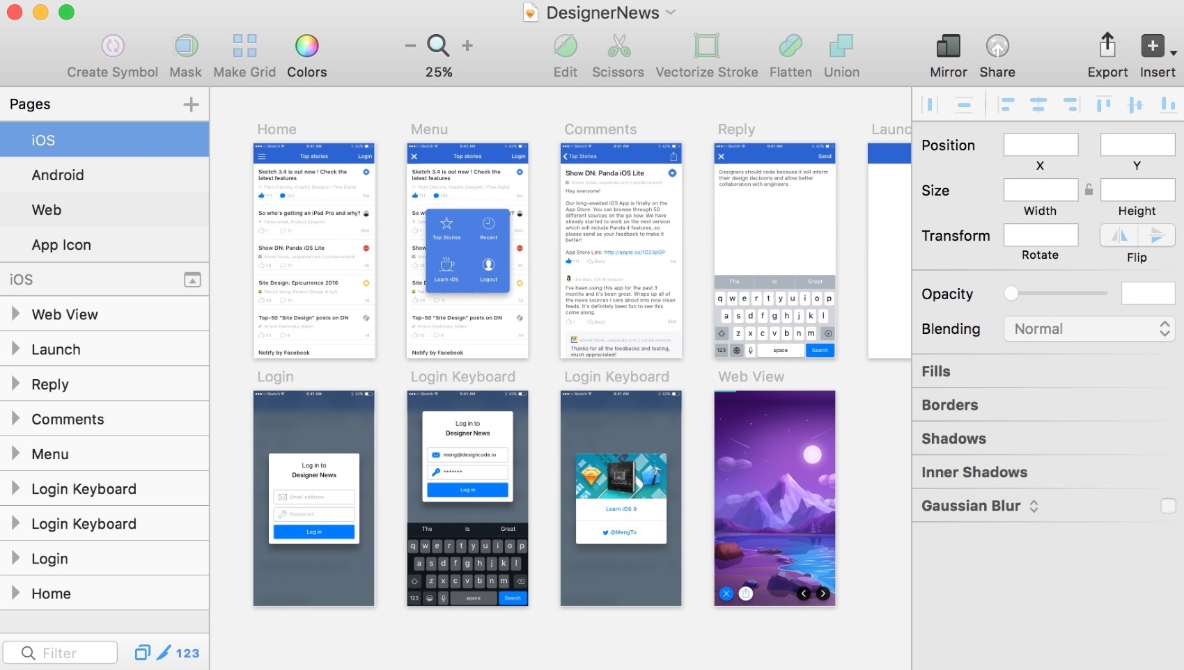 You can see that we have all these separations, and an extremely good order and structure of our application for screens and platforms on a single Sketch file: