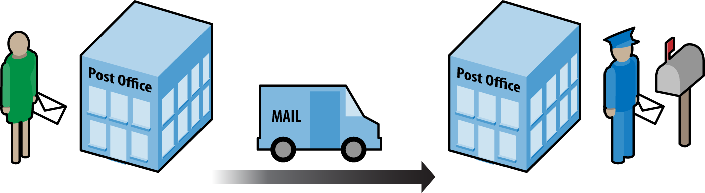模型是一种组织系统功能和特征的方法,用以定义系统的结构设计。设计可以帮助我们理解通信系统如何完成任务,从而形成一套协议。为了帮助我们理解模型,人们常常把通信系统比作邮政系统(图 1-1)。想象一下写一封信,然后送到邮局。在某个时间点,信件会被分类,然后通过某种运输系统送到另一个邮局。在那里,信件被分类并交给邮递员送往目的地。信件在途中会经过多个环节。系统的每个部分都在努力完成同一件事--投递邮件。但每个环节都有一套特定的规则需要遵守。在运输途中,卡车要遵守道路规则,将信件运送到下一个地点进行处理。检查员和分拣员要确保邮件的计量和安全,而无需过多考虑交通信号灯或转向灯。