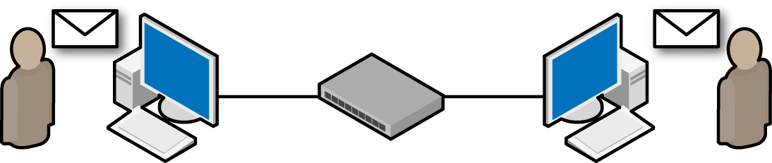 通信系统与此并无太大区别,因为在计算机上创建的信息在处理和传输过程中,每个相关设备都要执行某些功能并遵守一定的传输规则。图 1-2描述了一个典型的场景:两台计算机通过网卡通过网络设备连接在一起。两个人正在使用即时信息或电子邮件程序等应用程序进行通信。在某些时候,我们必须决定如何准确处理这种通信。毕竟,当你邮寄信件时,你不能随意使用某种语言来称呼信封或忽略邮政编码,就像邮车司机不能在错误的道路上行驶一样。