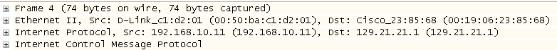 在以太网作为局域网基础设施的情况下,在第 2 层使用发送者自己的 MAC 地址作为源,在第 3 层使用其 IP 地址作为源来构建帧。目的地 IP 地址(或至少名称)通常是已知的,因此只需确定目的地 MAC 地址。图 4-1是封装 ICMP 报文中显示的这些地址的数据包捕获回顾。