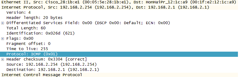 一般来说,ICMP 报文具有类似的结构。接下来的一系列图是 Wireshark 对同一个 ICMP 数据包的观察,每个图都指出了不同的方面。ICMP echo 请求是 IP 数据包的有效载荷,包含在数据字段中。ICMP 没有 TCP 或 UDP 报头。展开 IP 报头后,我们会发现 ICMP 的 IP 数据包有效载荷类型是 01。图 6-2 中突出显示了这一点。