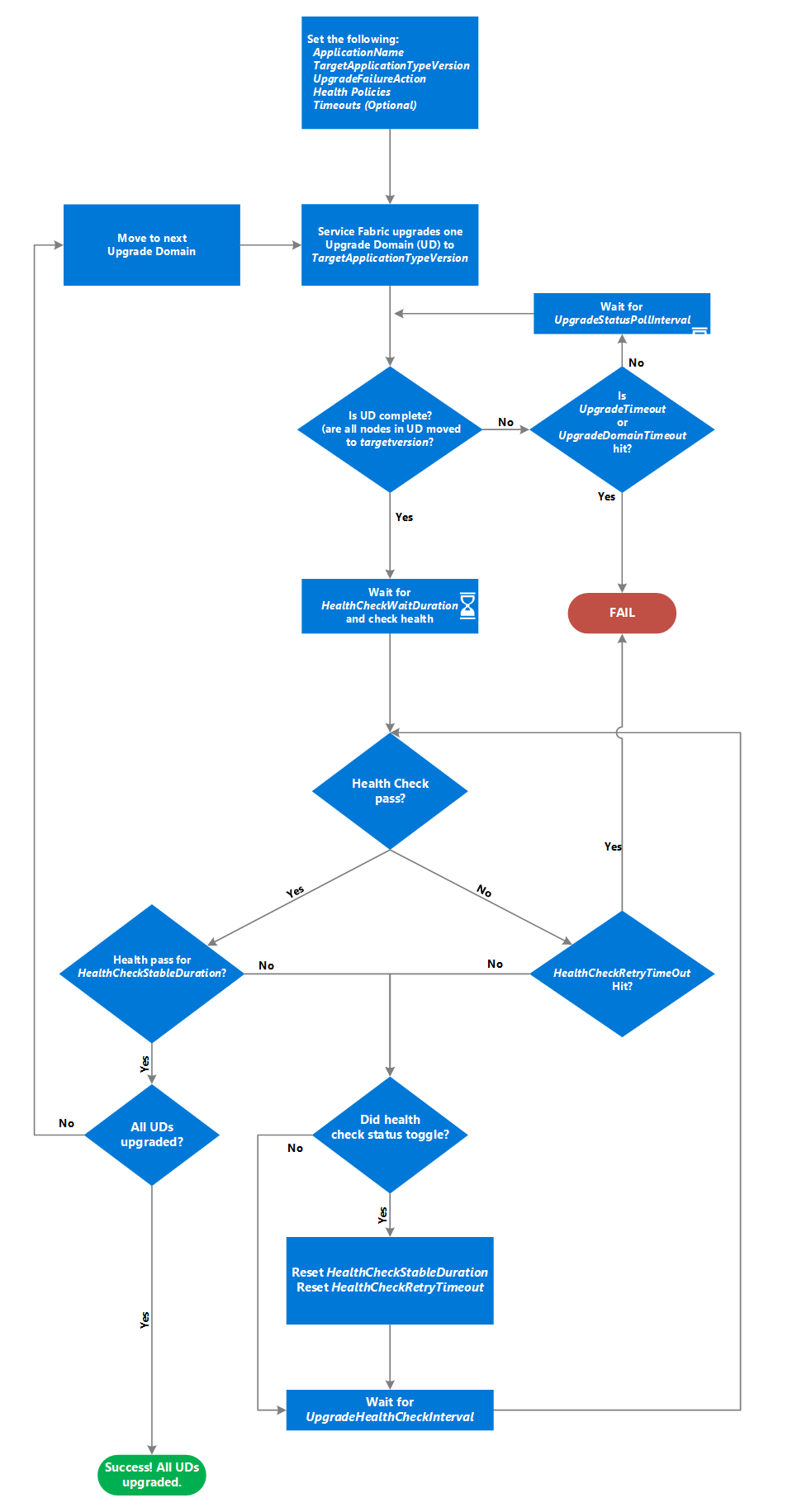 To perform the upgrade, Service Fabric performs a comparison of the old and the new application manifest. The application is upgraded only if there is a change in version number. The following flowchart explains the application upgrade process: