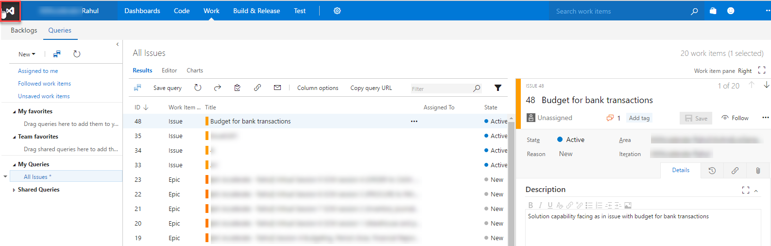 The following is the image of the issue automatically created in VSTS, and once it is in VSTS, you can leverage all your CMMI level practices to manage the issue lifecycle: