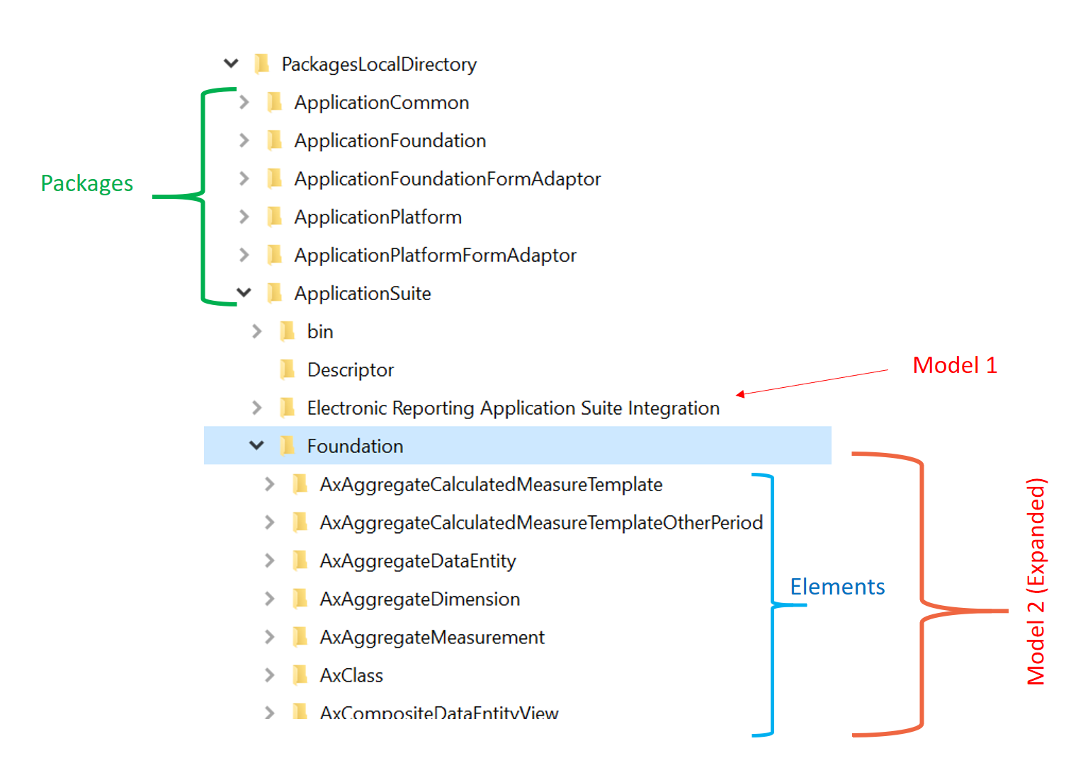 As shown in the diagram, PackagesLocalDirectory (called model store) is root folder which contains the individual packages for example ApplicationCommon, ApplicationFoundation, ApplicationSuite, and so on. Each package can contain one or more models; for example ApplicationSuite package contains multiple models Electronic Reporting Application Suite Integration and Foundation. Each model contains folders containing metadata ...