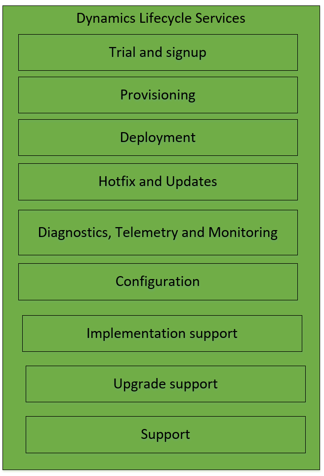 The following diagram shows the various services supported by LCS during the implementation, upgrade, and support phases of Dynamics 365 for Finance and Operations, Enterprise edition: