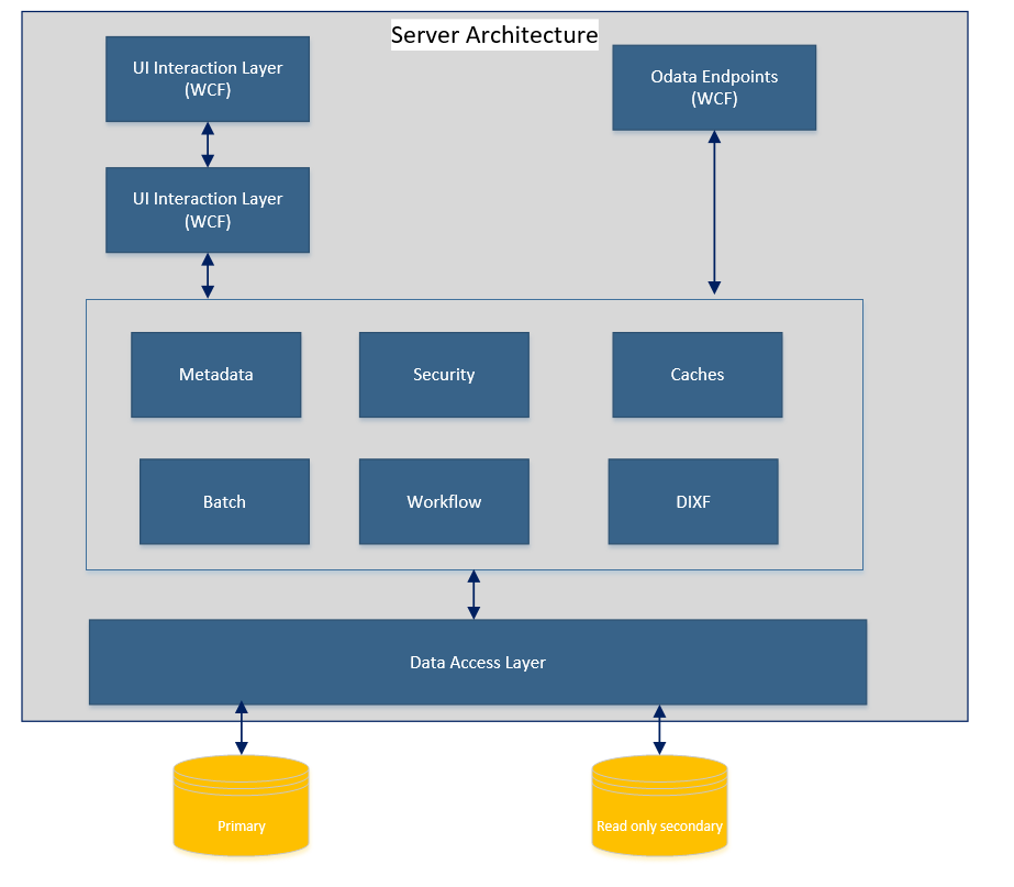 The Dynamics 365 for Finance and Operations application layer is primarily represented by application runtime, known as Application Object Server (AOS). AOS runs as an ASP.NET web application hosted on Internet Information Services (IIS). AOS has all the core kernel components (security, metadata, and data access), forms engine, UI interaction service, web services endpoints, and so on. Asynchronous batch processing capability and data management is provided by a Windows service running on each application server. The following diagram shows the key components of the server and how they are stacked together: