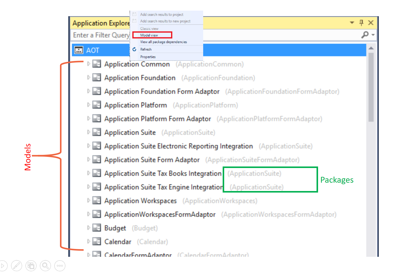 In Visual studio models and packages are represented in the Application Explorer. You can switch to model view by right clicking on the main node AOT and selecting model view. The following screenshot shows the model view of Application Explorer. As shown in the screenshot, all the models are represented as tree structures in the model view. Package names are displayed in the parenthesis for each model: