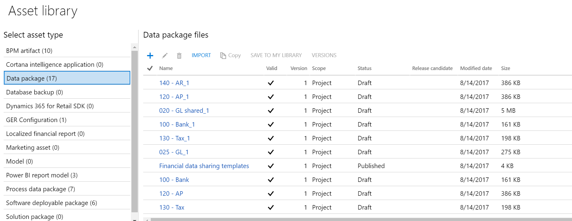 Once the data packages are downloaded from your initial configuration environment and the data is finalized, you can upload these data packages to your LCS project library. As shown in the following screenshot, the LCS asset library can be used as a repository for the data packages: