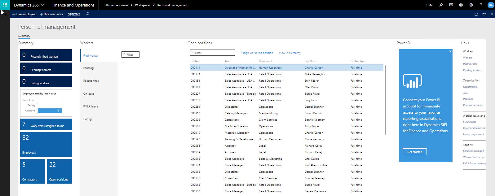 Workspaces are activity-oriented pages that are designed to increase the user's productivity. Workspace provides information that answers most of the targeted user's activity-related questions and allows the user to initiate more frequent tasks. As shown in the following screenshot, a workspace usually contains tiles (displaying counters or KPIs to answer a set of questions), a set of relevant lists, and action buttons (to initiate activities), graphs, charts, or Power BI dashboards, and a set of links to pages that are important but not frequently used for this activity: