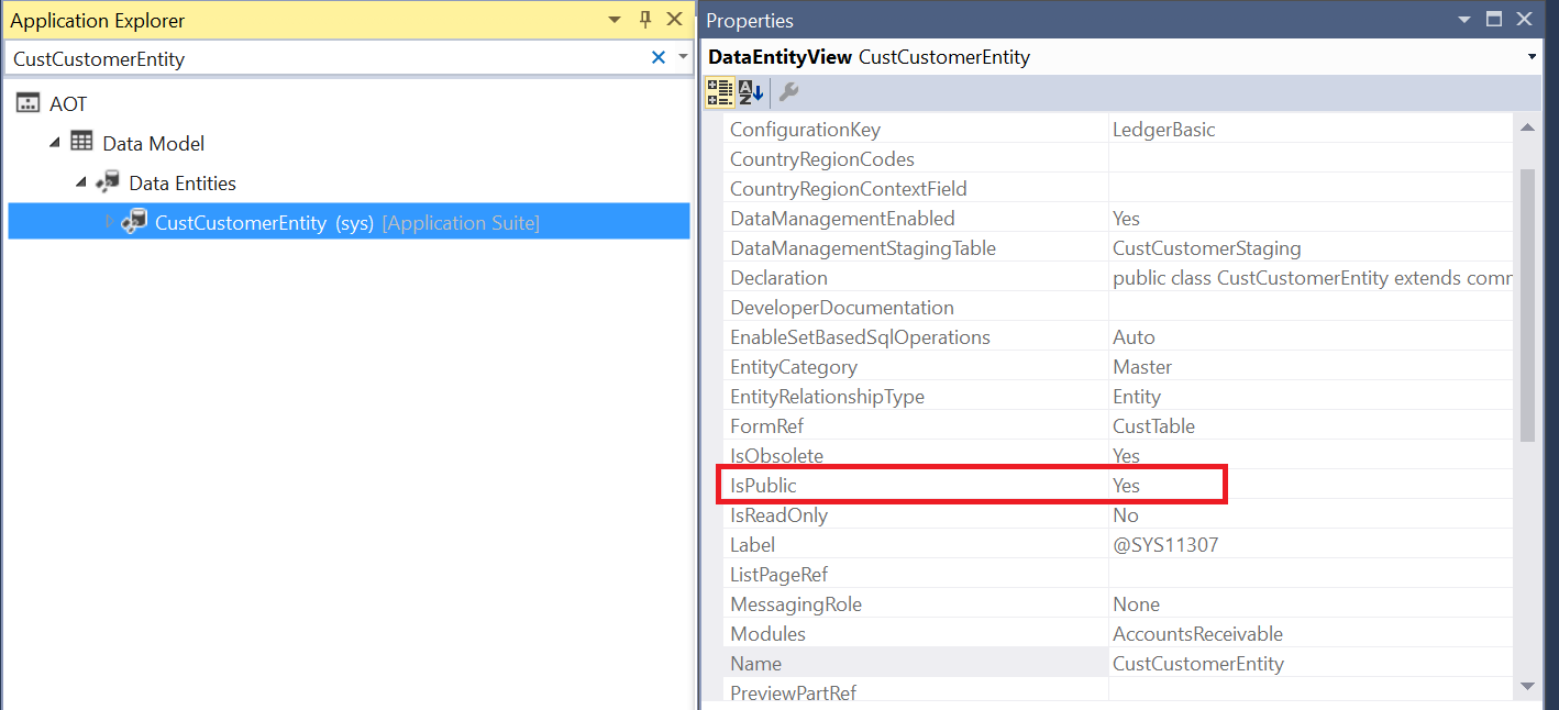 The following screenshot shows CustCustomerEntity in Visual Studio, marked with the IsPublic property to Yes to expose the entity as the OData endpoint: