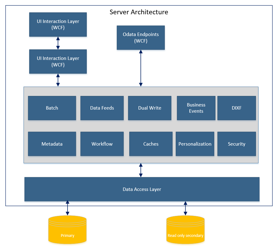 The Dynamics 365 for Finance and Operations application layer is primarily represented by application runtime, known as AOS. AOS runs as an ASP.NET web application hosted on IIS. AOS has all the core kernel components (security, metadata, and data access), forms engine, user interface interaction service, web services endpoints, and so on. Asynchronous batch processing capability and data management are provided by a Windows service running on each application server. The following diagram shows the key components of the server and how they are stacked together: