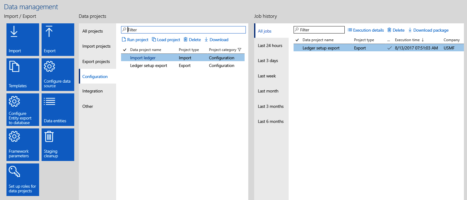 The following screenshot shows the data management workspace in Dynamics 365 for Finance and Operations: