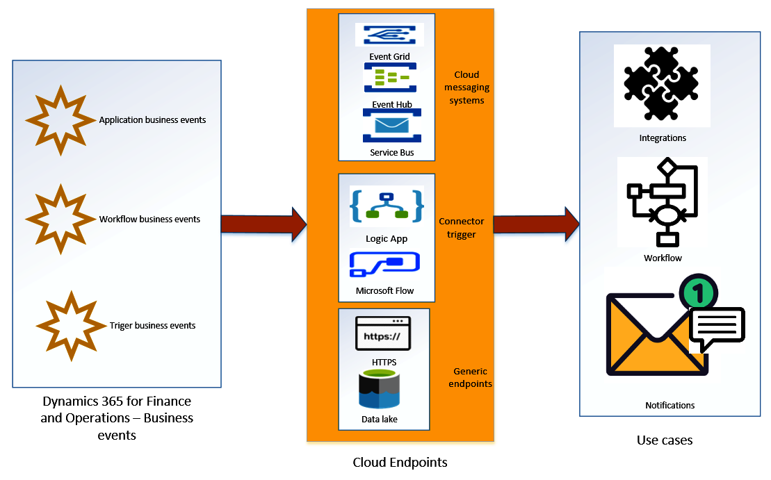 Business events introduce an event-driven integration model in Dynamics 365 for Finance and Operations. Business events occur when a business process is executed in the application. Some example business events could be a sales order being shipped or a purchase order being confirmed.