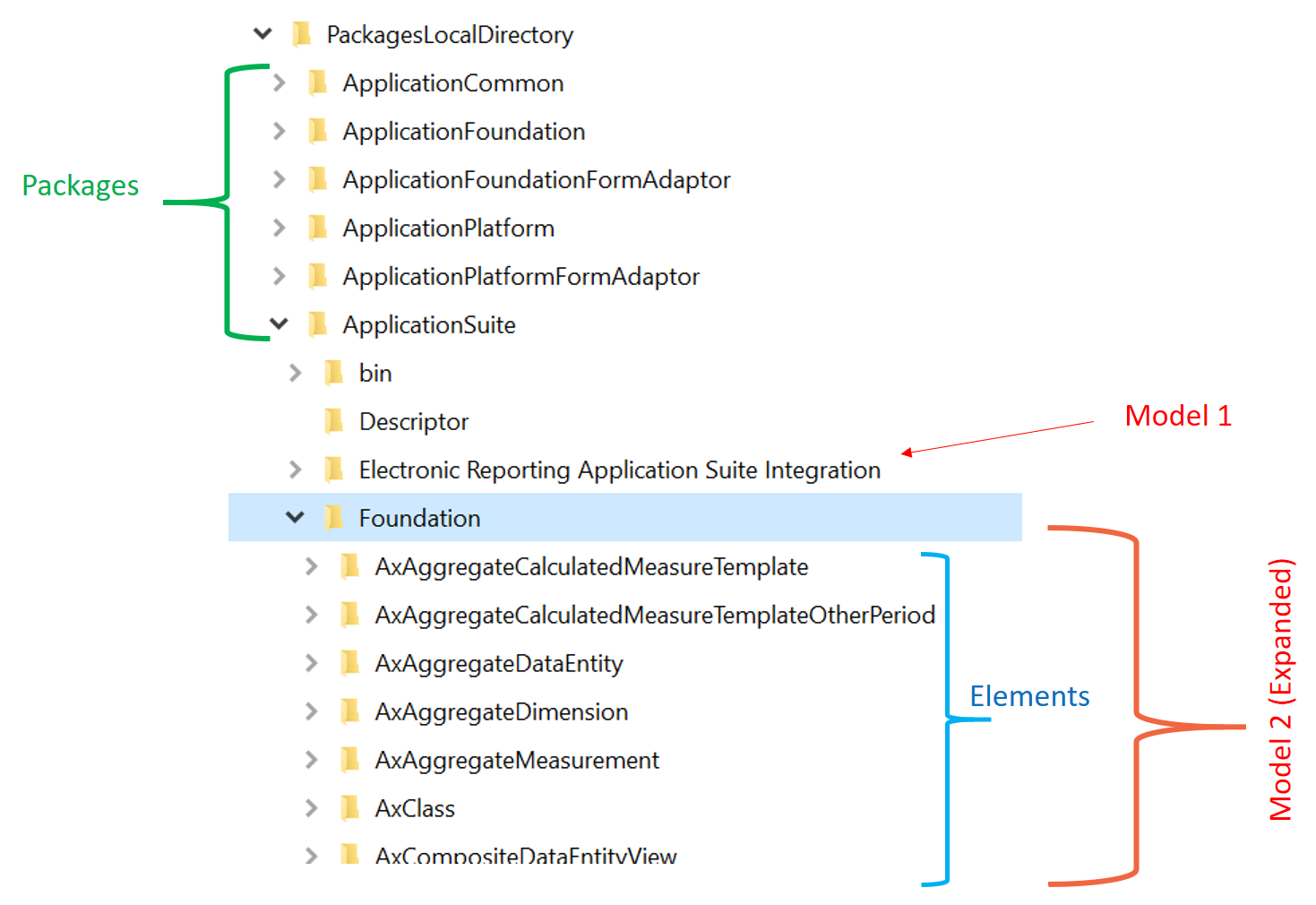 As shown in the preceding screenshot, PackagesLocalDirectory (called model store) is the root folder and contains the individual packages, for example, ApplicationCommon, ApplicationFoundation, ApplicationSuite, and so on. Each package can contain one or more models; for example, the ApplicationSuite package contains multiple models, that is, Electronic Reporting Application Suite Integration and Foundation. Each model contains folders ...