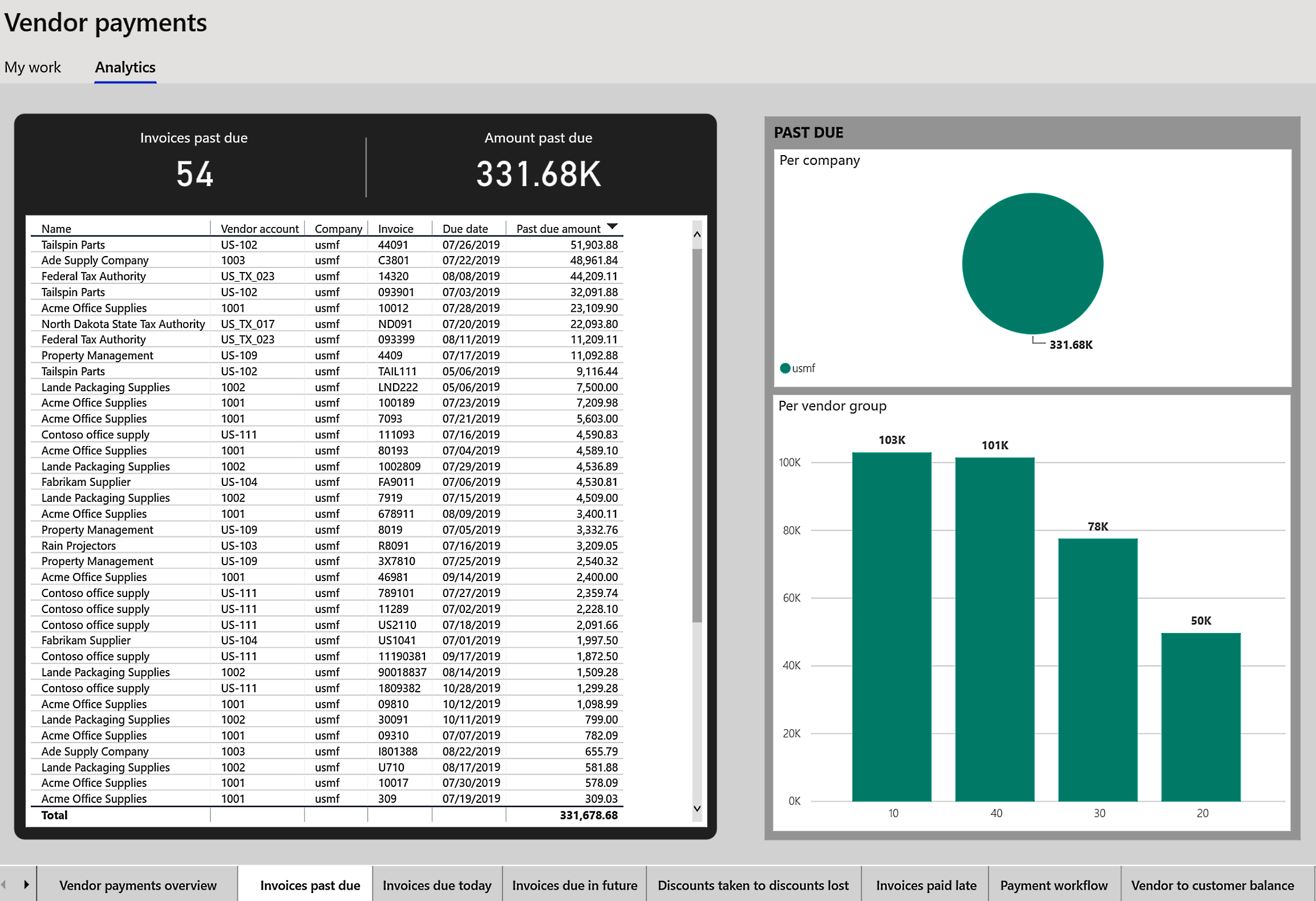 The following screenshot shows the Vendor payments analytical workspace available out of the box in Finance and Operations in the Account payable module:
