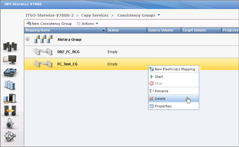 A consistency group can be deleted by clicking Delete from the Actions drop-down menu
