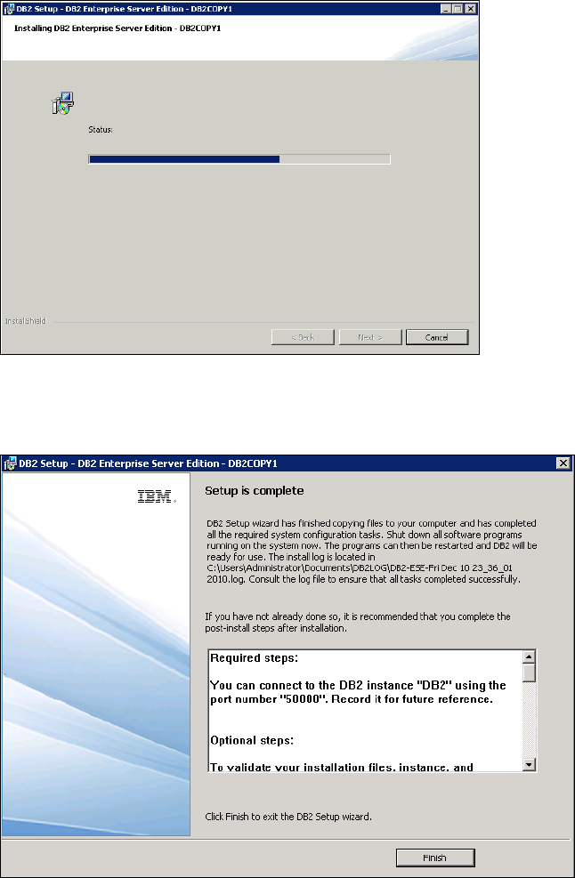 The DB2 installation proceeds and you see a progress window similar to the one shown in