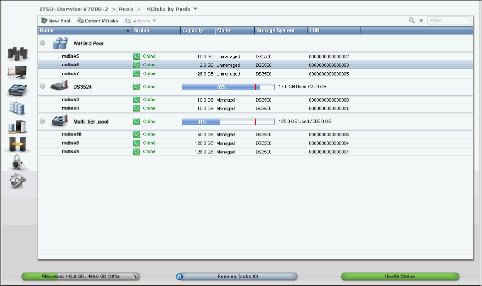 Figure 3-34 shows the MDisks that are available to the IBM Storwize V7000 system. The
