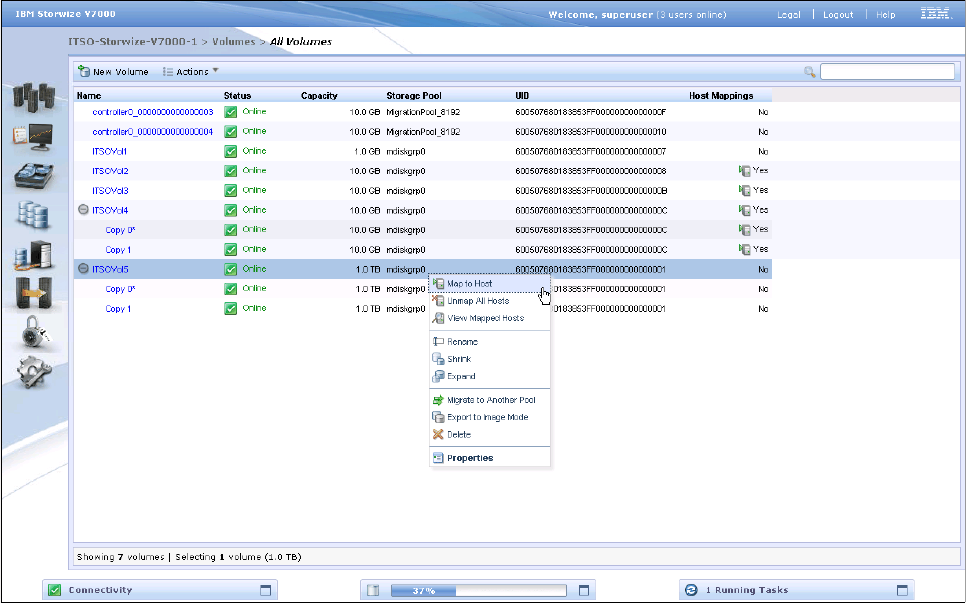 perform tasks on the volumes, such as shrink or enlarge them, map them to a host, or migrate