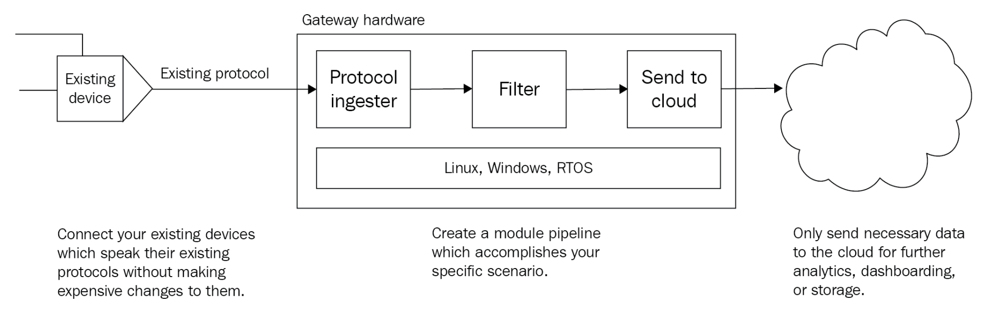 The Edge Gateway is in close proximity to the sensors and actuators and it is usually located on a customer site or on the equipment itself. For example, a wind turbine might contain a hundreds sensors and actuators that feed data into an Edge Gateway. The Edge Gateway then collects, digitizes, and forwards the data to the cloud and, sometimes, may also have edge analytics which can take detect patterns and anomalies at the edge itself. Edge Gateways usually support various types of protocols, such as Modbus and OPCUA to connect with the various types of industrial sensors, as can be seen in the following diagram: