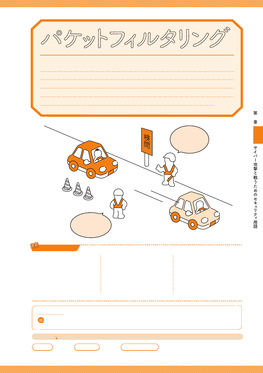 送 信 元 や 宛 先 の I P アドレ ス や ポート番 号 を チ ェックして 、 通 信 を 制 御 する 機 能 に パ ケット