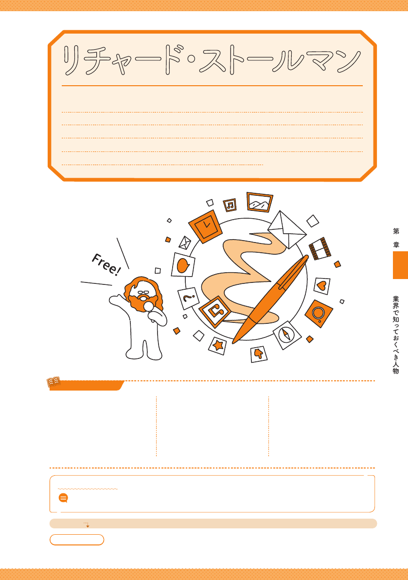 19 5 3 年アメリカ出身。G N U プ ロジェクトを創 設し、利 用者 がソフトウェアを自由に 使える