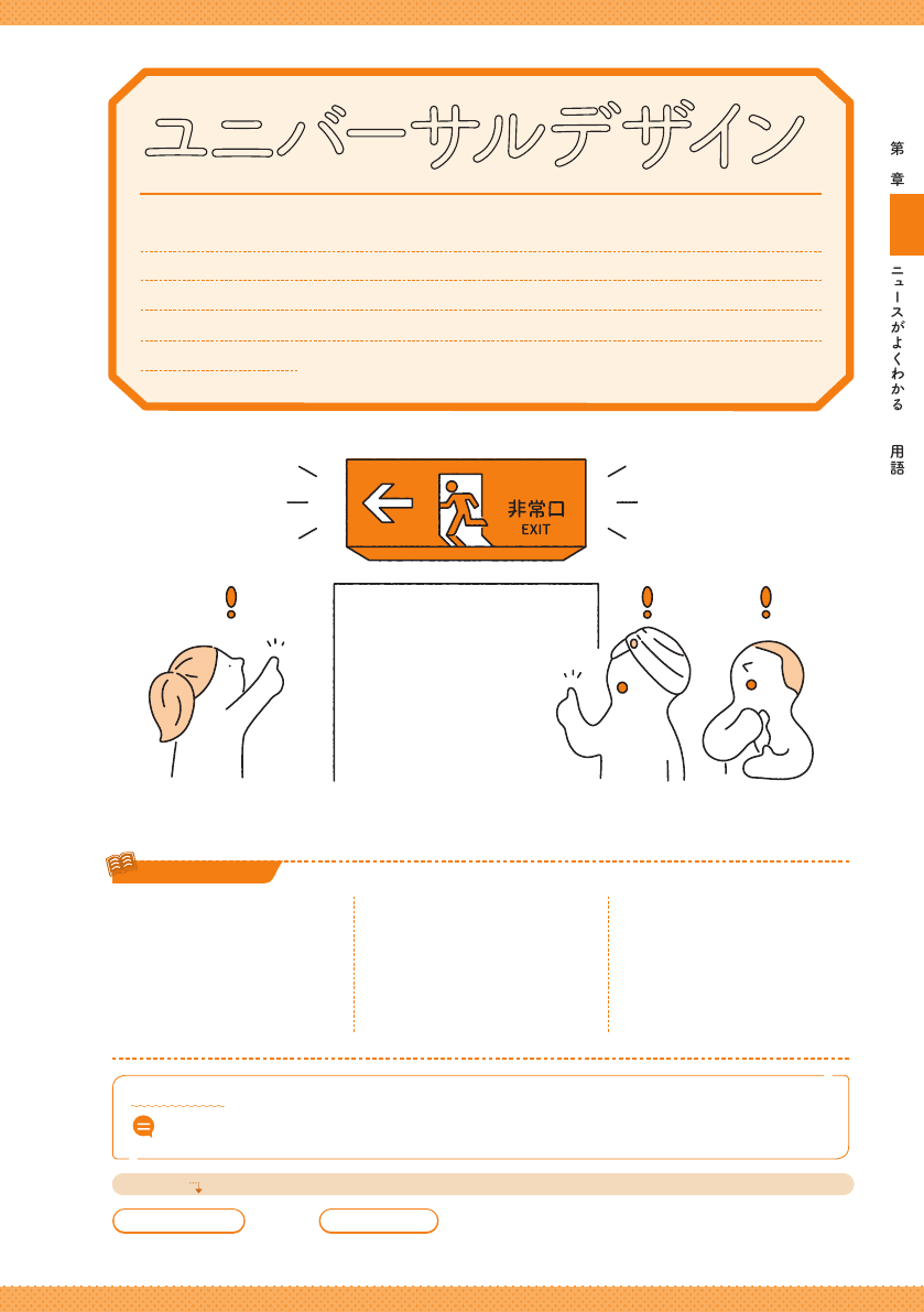 の 人 が 使 い や す い ことを目 指 した デ ザ イン の こと。自 動ドア や 多 機 能トイレ の ように 形 が あ