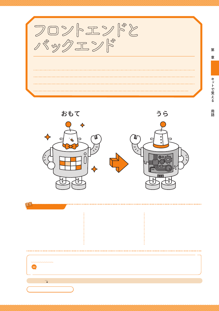 環 境 を バック エンドと呼 ぶ 。 W e b ア プ リの 場 合 、フ ロントエ ンド は W e b ブ ラ ウ ザ 向 け の