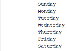 String days = "Sunday\n" + "Monday\n" + "Tuesday\n" + "Wednesday\n" + "Thursday\n" + "Friday\n" + "Saturday";