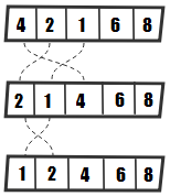 Bubble sort is a simple algorithm that basically bubbles up the elements of the array. This means that it traverses the array multiple times and swaps the adjacent elements if they are in the wrong order, as in the following diagram: